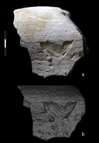 A deeply impressed cross-hatching carved into the bedrock, discovered in 2012. It has remained covered by an undisturbed archaeological level containing Mousterian artifacts made by Neandertals and is older than 39,000 years B.P.