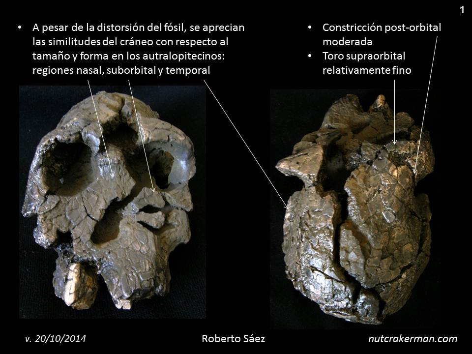 - Debería incluirse dentro de Australopithecus afarensis. De hecho, presenta algunos aspectos incluso más primitivos, como el pequeño canal auditivo, más parecido al de los chimpancés, Au. anamensis y Ardipithecus ramidus.