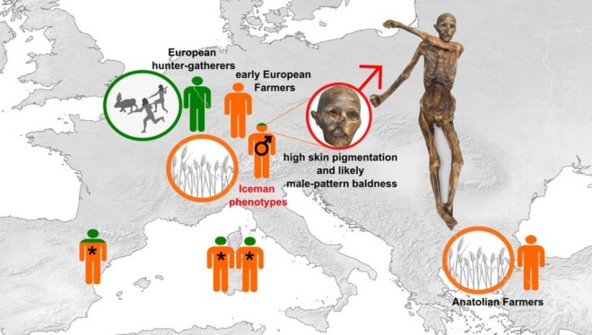 El haplogrupo paterno de Ötzi es raro en Europa y proviene de un antiguo sustrato genético que llegó desde Oriente Próximo con las migraciones que trajeron la agricultura a Europa a través de los Alpes hace 8000 años. Las sucesivas migraciones y otros eventos demográficos en Europa sustituyeron sólo en parte su linaje paterno (excepto en zonas geográficamente aisladas como Cerdeña y Córcega) pero causaron la extinción de su linaje materno. La rama materna se originó en los Alpes orientales hace al menos 5300 años en una población que no creció demográficamente.