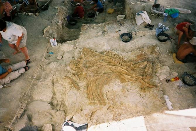 Pensamos que la causa de su concentración no fue la depredación: no hay depredadores que puedan abatir presas tan grandes. La causa de que allí mueran es porque se ponen enfermos y necesitan hidratarse especialmente, y Fuente Nueva era probablemente un manantial de aguas termales, similares a los manantiales que hoy sigue habiendo por la cuenca de Baza, de aguas hipotermales entre 20-22 º C. Por ejemplo, se ha encontrado un macho gigante con una defensa de 2,5 m, que medía al menos 5,5 m en la cruz y pesaba 14 o 15 Tm (frente a las 5,5-6 Tm de los elefantes africanos actuales). También hay hembras y crías. Y cuando esa megafauna se muere hay mucha alimentación que repartir, y acuden los homínidos y los carnívoros, no solo los carroñeros sino los cazadores que no desprecian esa comida ofrecida en abundancia. En torno a estos animales se han localizado coprolitos de hiena y al menos 2000 herramientas líticas.