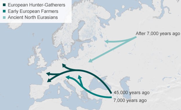 1) Se confirma el hallazgo de una tercera contribución genética de los antepasados de los europeos modernos, tal como se había previsto en otra publicación anterior de 2014 sobre el genoma de 9 individuos. De esta forma, la población actual europea proviene de una mezcla genética de 3 poblaciones a lo largo de los últimos 8000 años: