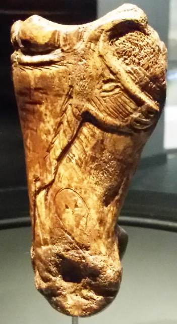 - La cabeza es especialmente rica y variada en los detalles grabados: ollar, boca, ojo, oreja con orificio auditivo, cuernos aprovechando el borde del hueso, morro resaltado en el plano del contorno.