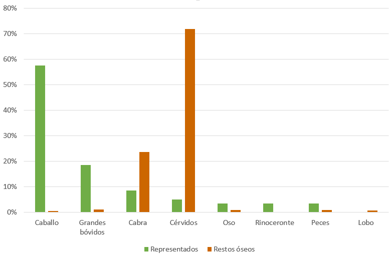 Relación entre representaciones y restos de fauna en Ekain. Gráfico elaboración propia a partir del estudio de Jesús Altuna, 1984 (ver referencia 2)