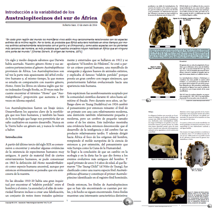 Artículo Roberto Sáez en NautilusEl papel tiene aún ese encanto singular frente al formato digital… Mi primer artículo en papel se ha publicado en la revista de divulgación paleontológica Nautilus. En él hablo de uno de mis temas favoritos: la enorme variabilidad morfológica de los Australopitecinos y en particular los del sur de África, tal vez algo menos protagonistas en relación a los del este dentro de la filogenia humana. Es un poco largo, fruto de varios meses de trabajo (y disfrute): comienzo con Darwin -cómo no-, el contexto histórico de los primeros hallazgos, y luego realizo un recorrido por 20 especímenes clave. Os dejo la introducción del artículo y al final los sitios donde encontrar la revista.