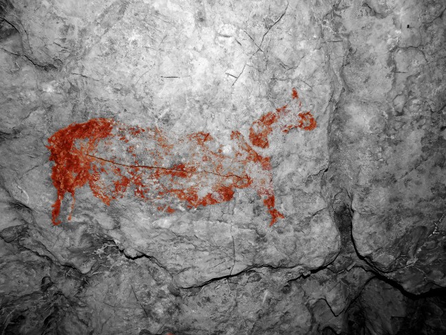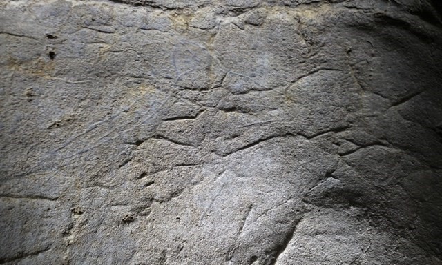 Una sección de muro está completamente cubierta de marcas longitudinales grabadas, y el esquema de un bisonte. Recuerdan a representaciones de Isturitz y de otras cuevas al norte de los Pirineos.