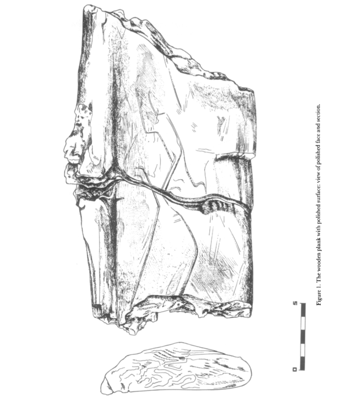- Tablita de Gesher Benot Ya’aqov (Israel), 700-800 ka: una tabla de sauce hallada en un contexto achelense, que presenta una superficie muy plana. El ángulo del pulido, la fragilidad del material y la no correspondencia con procesos tafonómicos, llevó a proponer a sus investigadores que esta plaquita fue pulida por humanos con un cuchillo. ¿Cuál sería su utilidad?
