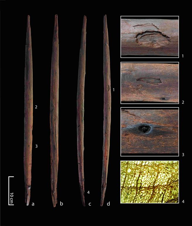Por ahora es la publicación más reciente de esta lista. Es una punta de madera de tejo que mide 15 cm y fue fabricada por neandertales hace 90 ka. Le aplicaron fuego para endurecerla o tallarla, y la emplearon para cavar, extraer raíces y tubérculos, como lanza, o para liberar núcleos de sílex embutidos en arcilla. Durante su tratamiento se curvó al perder el agua.