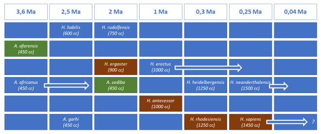 – En marrón = Especies humanas más probables en nuestro linaje directo.