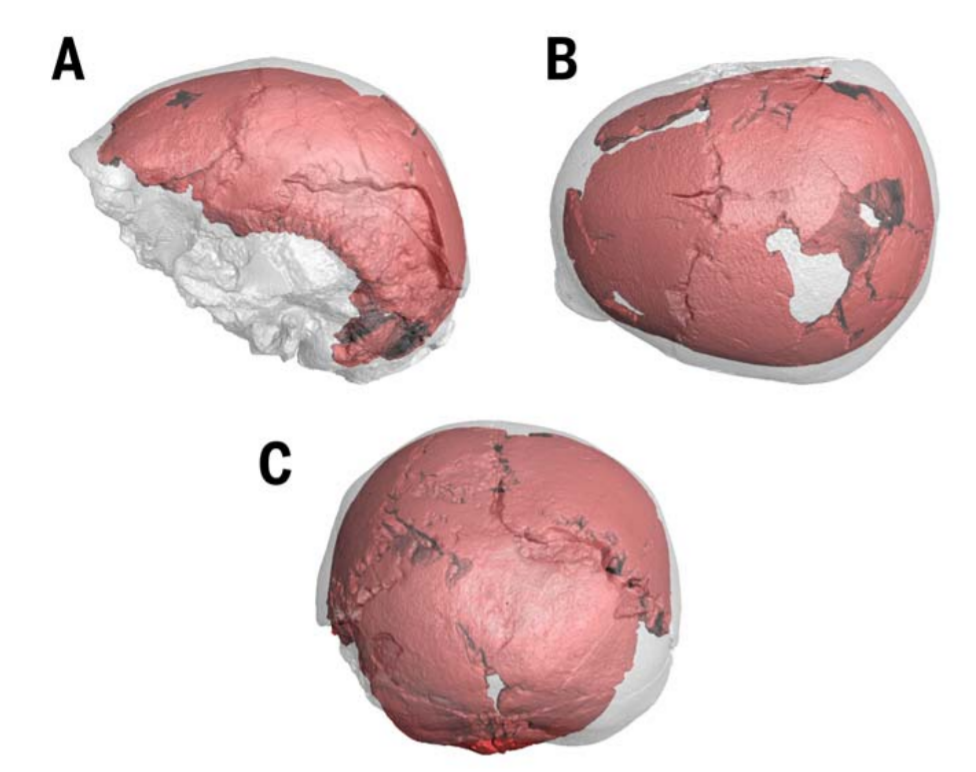 Comparisons of the DNH 134 cranium with the Mojokerto juvenile H. erectus cranium [~1.5 Ma, Java, Indonesia]. DNH 134 (red) superimposed on the Mojokerto cranium (gray) after scaling both specimens to the same bregma–inion length. Credit: Herries et al (2020)