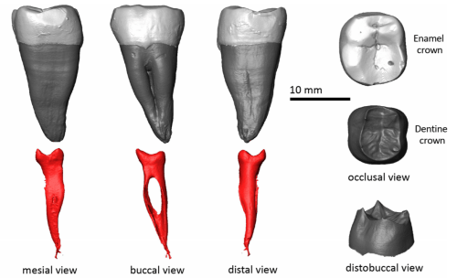 Human lower second molar (F6-620). Source: Hublin JJ et al (2020). Initial Upper Palaeolithic Homo sapiens from Bacho Kiro Cave, Bulgaria. Nature