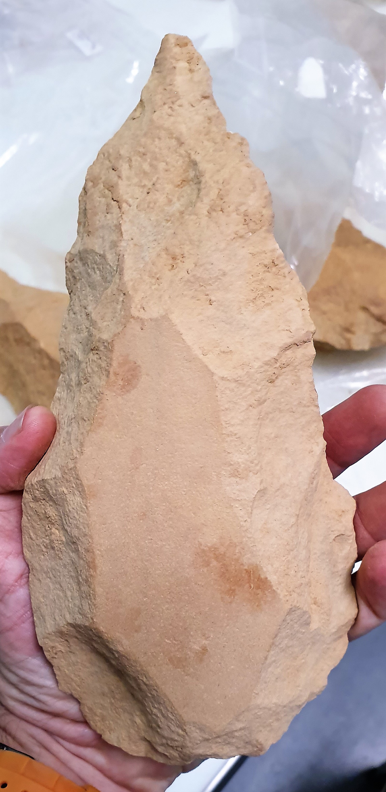 - PM4 is the most iconic level, where a big accumulation of Large Cutting Tools (LCTs) was found. These are Acheulean pieces of 18.6 cm on average (compared to the 8 to 15 cm of the European Acheulean). Some of them reach 27 cm. In total they are 290 pieces, of which 159 do not have any fluvial abrasion. The piece density is 10-13 per m2. The assemblage is composed of handaxes (65%), cleavers (7%) and trihedral peaks (10%), the rest being fragments of handaxes and flakes. The practical absence of flakes, cores and waste is surprising, and there are no hammers either: this is an accumulation of finished tools, 70% of which are LCTs. The raw material is quartzite.