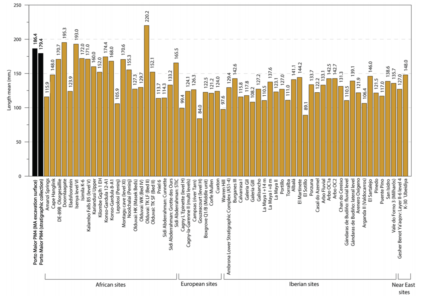 Imagen: Promedio de longitud de piezas achelenses de yacimientos africanos, europeos, ibéricos y de Oriente Próximo. Crédito: Méndez-Quintas et al. (2018)