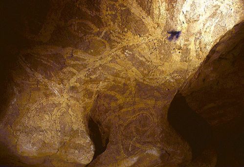 Cudón: signos en el techo del vestíbulo (izd), puntos y vulva bicolor (dch). Foto cortesía de Ramón Montes