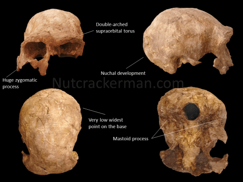 - Destaca también el desarrollo occipital en ambos fósiles, más acusado en ER 3733, y la zona de mayor anchura de estos cráneos situada en la parte inferior y muy posterior.