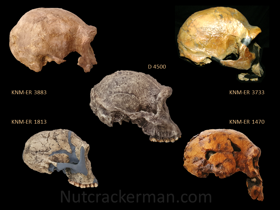 Interestingly, ER 3883 has also been compared with the famous D4500 skull from Dmanisi (slightly older at 1.8 Ma), to highlight that the general profile of D4500 is more similar to that of ER 3883 and ER 3733 (Homo erectus/ergaster), than that of other East African skulls such as ER 1813 (H. habilis) and ER 1470 (H. rudolfensis).