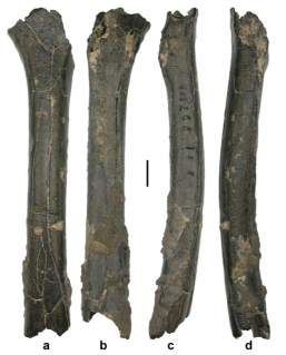 The partial femur TM 266-01-063 from Toros-Menalla, Chad, in anterior (a), posterior (b), medial (c), and lateral (d) views. Scale bar = 2 cm. Credit: R. Macchiarelli, A. Bergeret-Medina, D. Marchi et al. (2020)
