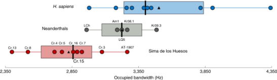 The occupied bandwidth of modern humans (blue), Neanderthals (grey) and the Sima hominin (red). Source: Conde-Valverde M et al (2021)