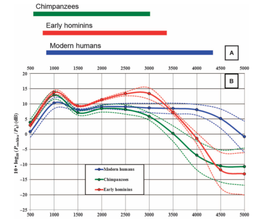 Mientras tanto, el estudio de la audición de los australopitecos y de los parántropos concluyó que estos carecían de la mencionada sensibilidad entre 3-5 KHz, y su audiograma era mucho más similar al de los chimpancés y otros simios, que al humano.