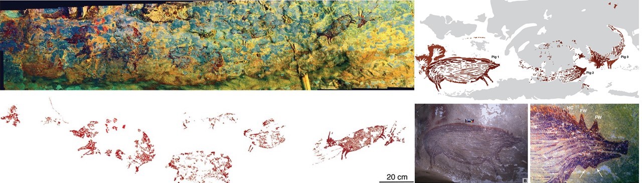- Dos figuras de suidos en la isla de Célebes (Sulawesi) en Indonesia, han sido noticia con solo un año de diferencia por ser las pinturas rupestres figurativas más antiguas. A la izquierda un panel en la cueva de Leang Bulu Sipong 4, datado en 43,9 ka, que puede representar una posible escena de caza, con cerdos verrugosos, cuerdas y teriántropos, que fue publicado en diciembre de 2019 [+info]. A la derecha, otro de estos cerdos nativos de la isla, pintado en la cueva de Leang Tedongnge [+info].