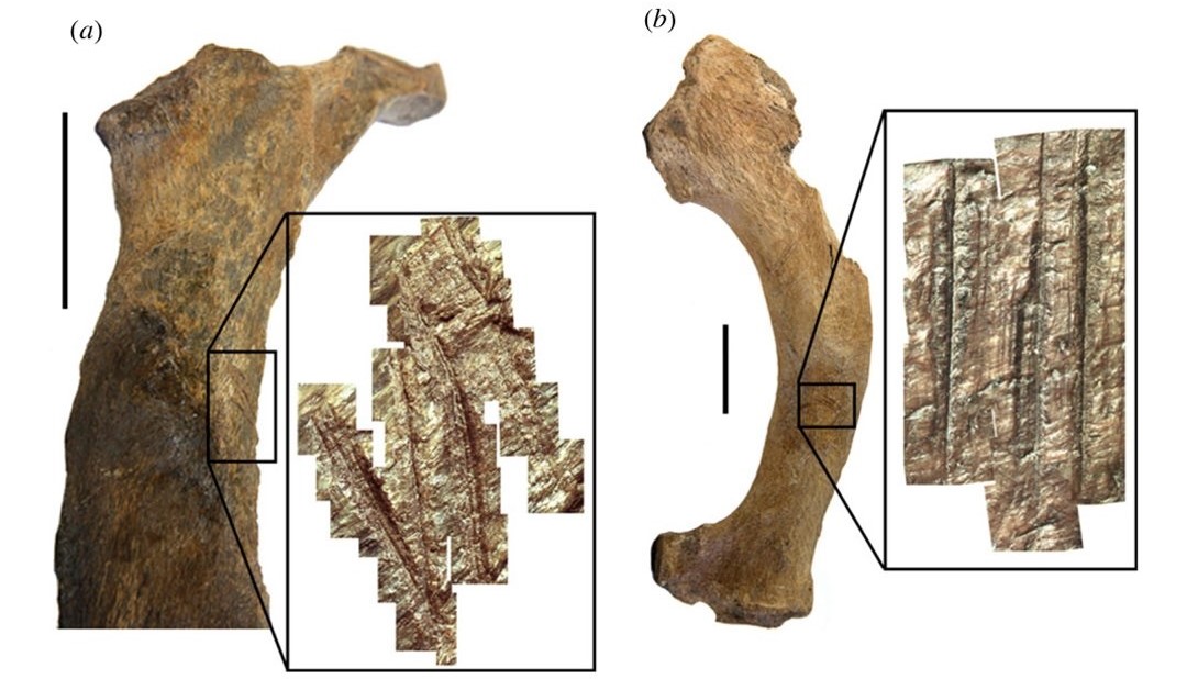 Marcas de corte en huesos de fauna del Arroyo del Vizcaíno (Uruguay). Crédito: Domínguez-Rodrigo et al (2021)