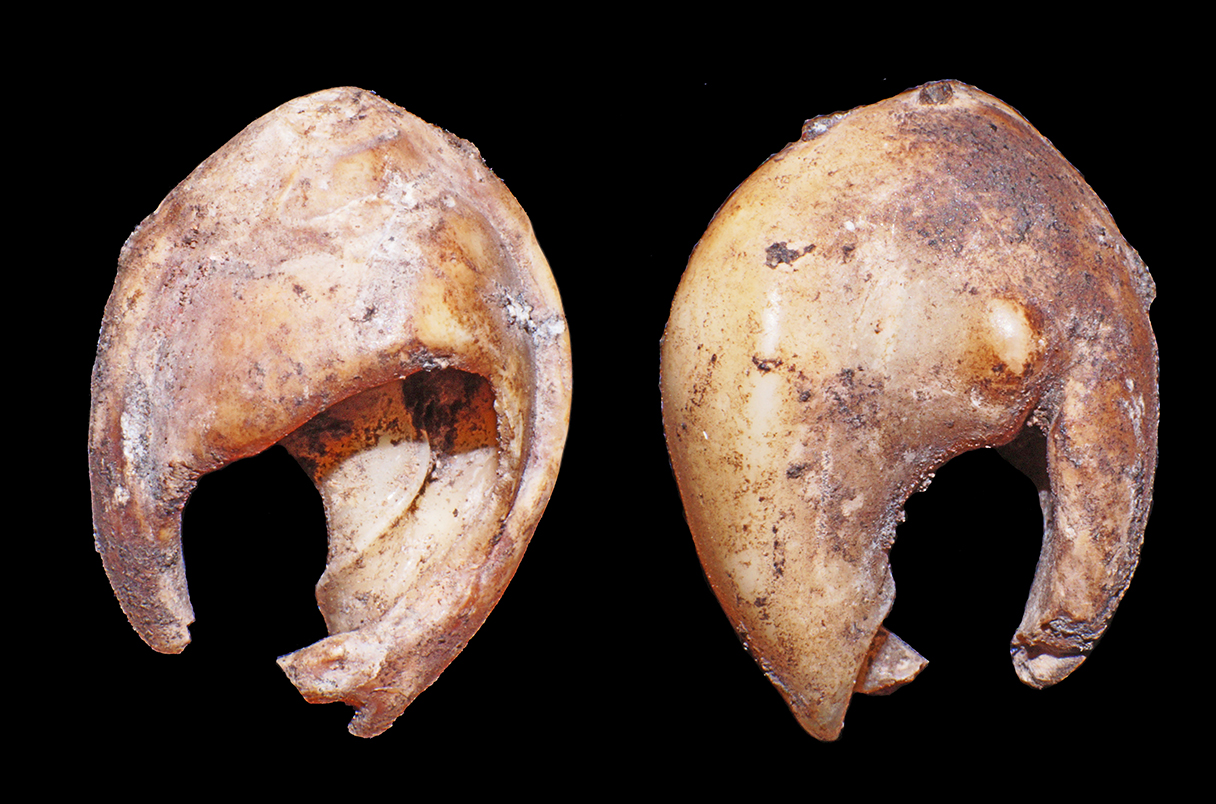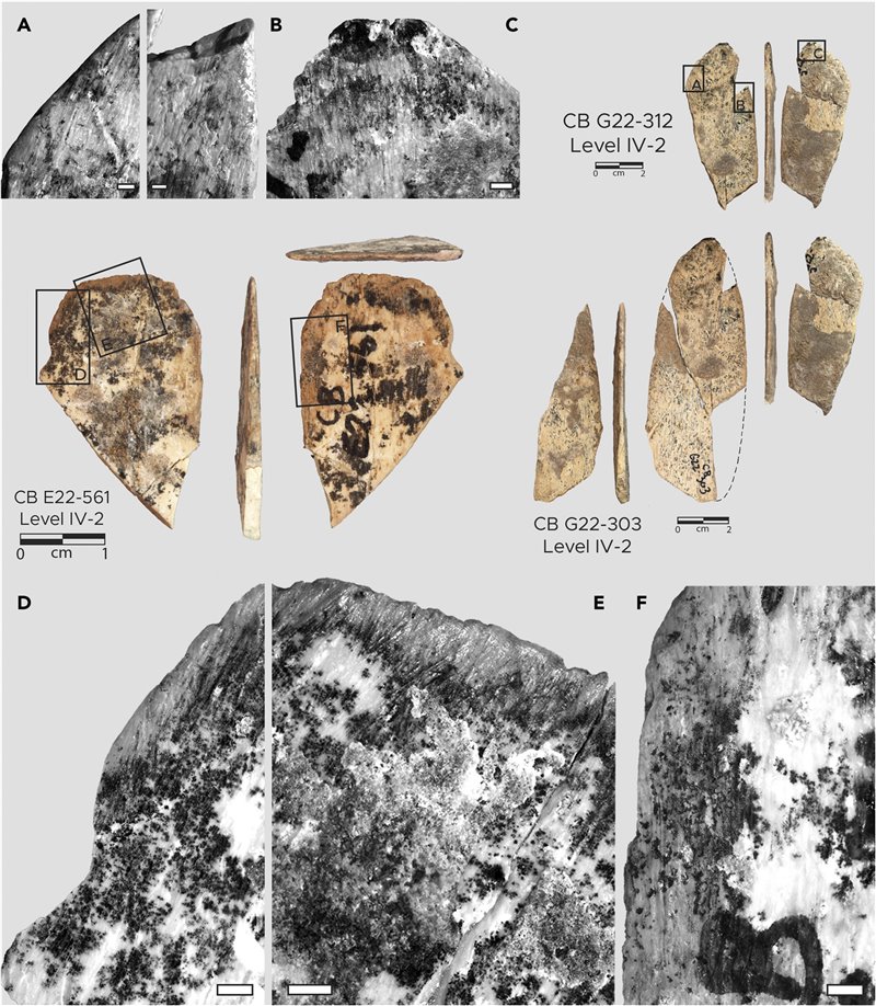 - Precisamente de la mencionada cueva de Contrebandiers procede un conjunto de 60 instrumentos de hueso realizados a partir de costillas de bóvidos hace unos 120 ka, que se utilizaron para tratar piel de zorro, chacal y gato montés, y fabricar vestimentas, ornamentos o la interesante posibilidad de bolsas de almacenaje. Destaca el hallazgo de un diente de un cetáceo y la opción de que fuera usado como herramienta [+info].