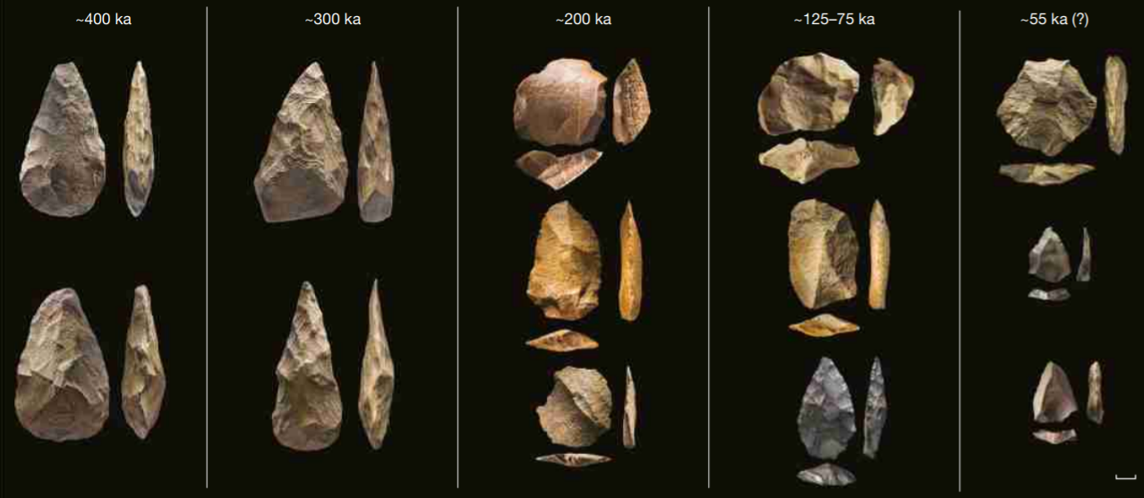 - Seguimos en el interesante umbral de hace unos 400 ka. Por entonces se estaban sucediendo distintas migraciones humanas a través de la denominada Arabia Verde hacia el suroeste de Asia (y seguramente también desde Asia «de vuelta» hacia África). Cambios climáticos conllevaron periodos húmedos en la región del actual desierto del Nefud, produciendo lagos y ríos que transformaron el paisaje en pastizales ricos en recursos. En el sitio de Khall Amayshan 4 (KAM 4) se han identificado seis de estas fases climáticas, con presencia humana en cinco de ellas: 400 ka, 300 ka, 200 ka, 130-75 ka y 55 ka. Los útiles líticos ilustran bien la evolución tecnológica en cada una de esas fases, desde los bifaces achelenses hasta las industrias del Paleolítico medio y de superior. El hecho de que cada ocupación traiga su propia cultura indica también una discontinuidad de población en el suroeste asiático [+info].