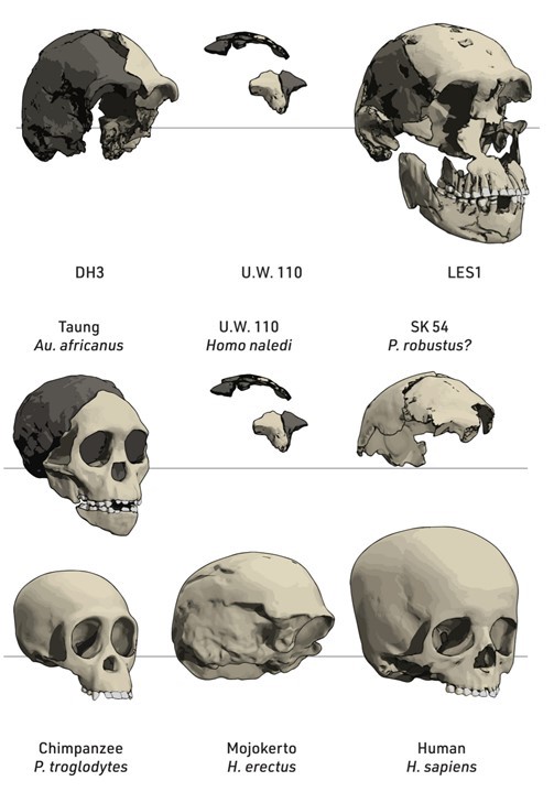 3D reconstruction of the immature individual from locality U.W. 110 compared with other Homo naledi specimens (top) and other hominin (bottom). Credit: Brophy J.K. et al. (2021)