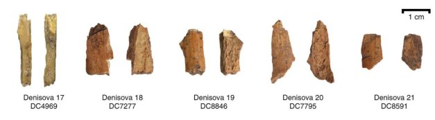 5 nuevos huesos de hominino de la cueva Denisova: 3 denisovanos (19, 20, 21), un neandertal (17) y otro sin asignar (18). Crédito: Brown et al (2021).
