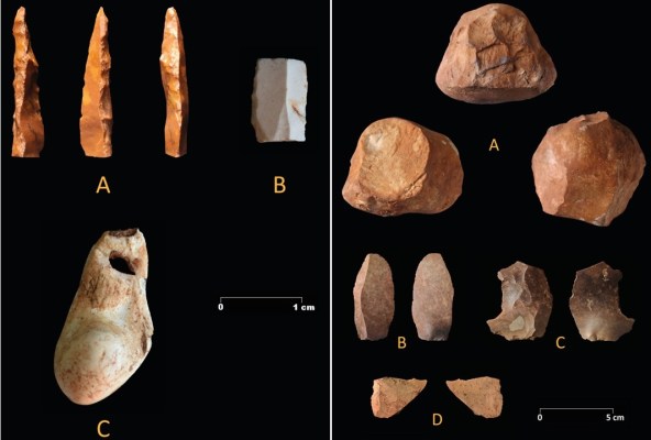 Cueva Ardales. IZDA=objetos singulares en zona 5: A-punta de Gravette, B-hojita retocada, C-canino de ciervo perforado. DCHA=objetos del Paleolítico medio en zona 3: A-núcleo de cuarcita o herramienta pesada, B-hoja, C-lasca Levallois, D-raedera. Crédito: J. Ramos-Muñoz et al (2022).