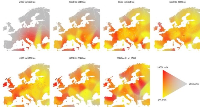 Lo que se ha visto es que hasta hace 5000 años las poblaciones humanas eran mayoritariamente intolerantes a la lactosa, y eso a pesar de que los humanos llevaban bebiendo leche desde hace casi 10000 años. El ADN antiguo de 1786 humanos prehistóricos de Asia y Europa muestra que casi todos eran intolerantes.