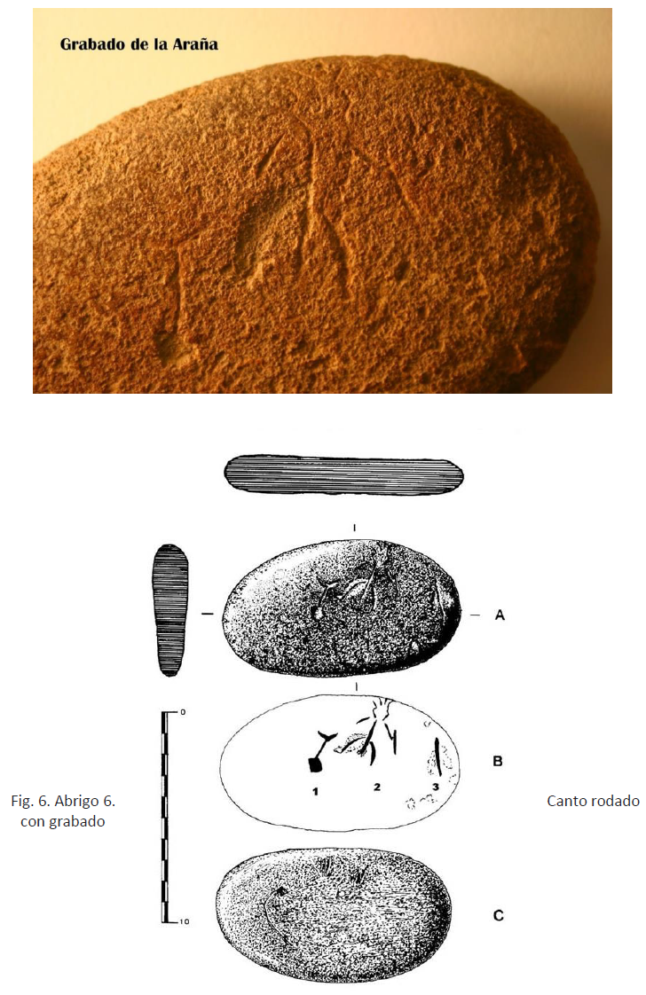 Del Abrigo 6 procede un canto de 11 x 6,5 x 2 cm, con tres grabados en una cara y una fuerte erosión en la otra, de unos 7,5 ka. La figura principal es un humano representado de forma esquemática, que tiene un tocado, y un palo o vara en una mano. Junto a ella aparecen representaciones lineales que, en relación a otros paralelos aparecidos en la península ibérica, han sido interpretados como un difunto yacente y asistentes a la ceremonia en curso.