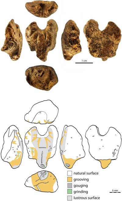 Tres fragmentos óseos tallados y agujereados hace 25 ka en Santa Elina, Brasil. Crédito: Thais Rabito Pansani.