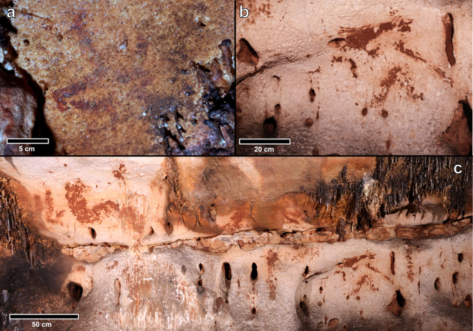 Representaciones gráficas en Cova Dones: a) cabeza de urogallo pintada; b) cabeza de caballo hecha con arcilla; c) panel con varios motivos pintados con arcilla, incluidos animales y signos. Crédito: Ruiz-Redondo, Barciela y Martorell (2023)