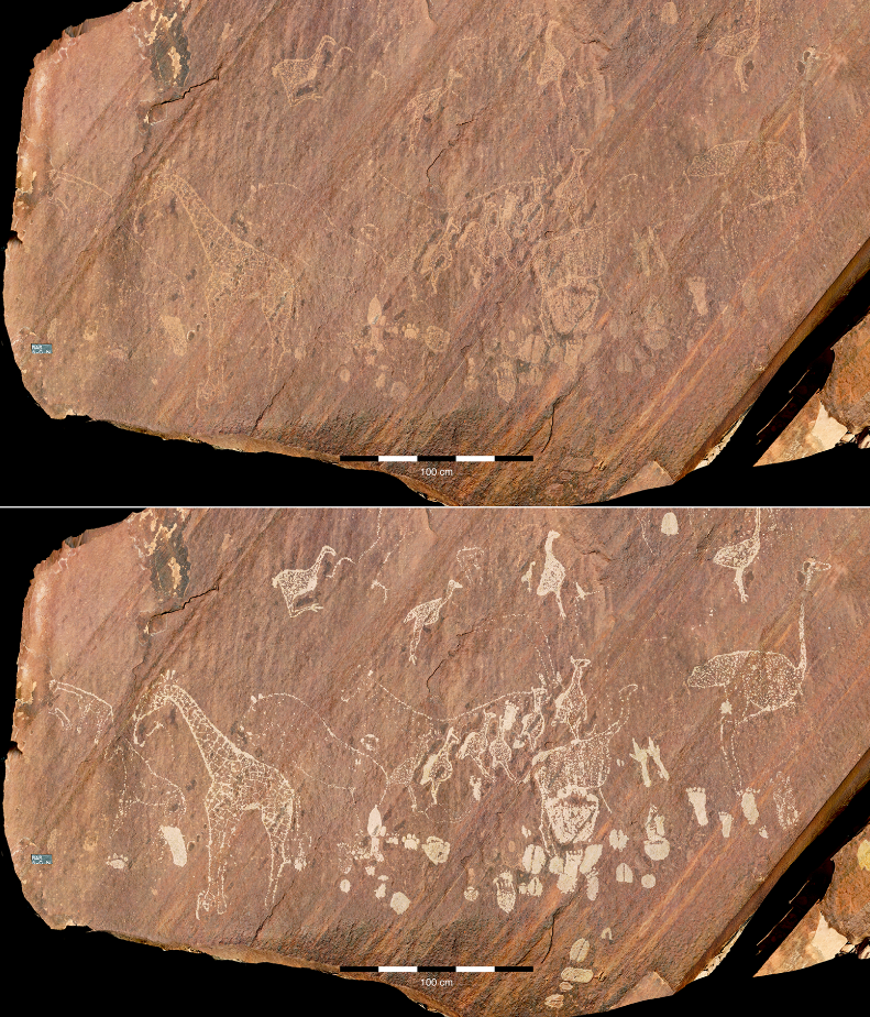 - Expertos indígenas en rastreo han investigado 513 grabados en el arte rupestre de la LSA (Late Stone Age) de los cazadores-recolectores de las montañas Doro Nawas (Namibia). Este trabajo demuestra que la variedad de fauna es mucho más rica en las huellas grabadas que en las representaciones de animales de la misma tradición de grabado. Esto obedecería a que los grabadores tomaron decisiones deliberadas basadas en la cultura, sobre los tipos de huellas de un animal en particular que representarían con mayor frecuencia. Estas preferencias confieren un carácter específico a cada especie presentada, tanto a través de la dirección preferida de las huellas en la pared de roca como a través de características como la preferencia por machos jóvenes entre especies como el cerdo salvaje y el duiker o por hembras mayores, por ejemplo, en el leopardo. y gallina de guinea [+].
