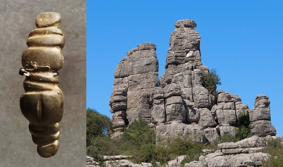 No quería finalizar el artículo sin mencionar a este excepcional objeto. Fue descubierto en la Cueva del Toro, en la sierra de El Torcal, cuyas primeras ocupaciones datan del Neolítico inicial. Este lugar se considera que fue un santuario donde se realizaban actividades relacionadas con la fertilidad, la naturaleza y los antepasados. Recordemos que el tholos de El Romeral está orientado hacia este espacio.