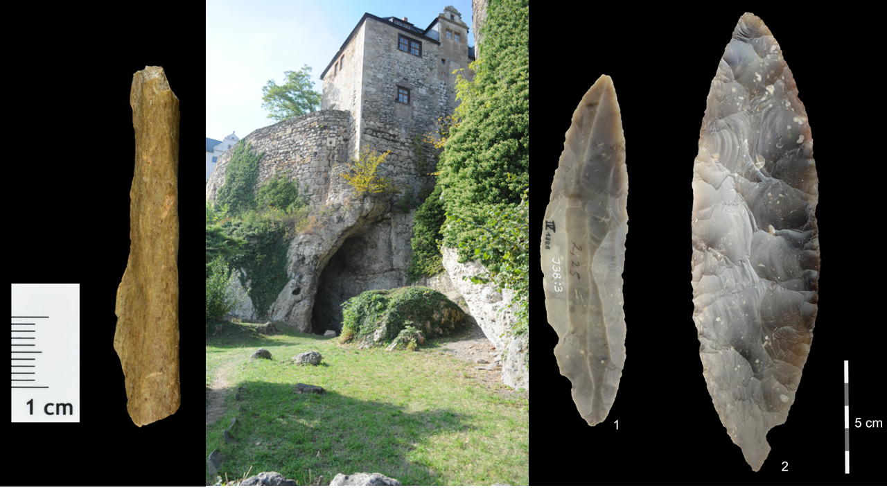 Fragmento de hueso humano de la cueva Ilsenhöhle y entrada a la cueva bajo el castillo de Renis (créditos Tim Schüler/TLDA). Herramientas de la cultura LRJ (crédito Josephine Schubert/Museum Burg Ranis).
