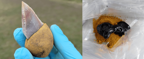 Herramienta pegada a un mango hecho de betún líquido con un 55% de ocre añadido (a la derecha, antes de mezclarse). Crédito: Patrick Schmidt, Universidad de Tübingen.