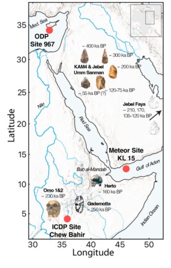- Un estudio correlaciona la previsibilidad climática con las posibles rutas africano-árabes de expansión de Homo sapiens. Hubo cambios importantes en la dinámica del paleoclima espaciotemporal entre 400 y 150 ka, entre húmedo y seco, presumiblemente impulsados por cambios en la amplitud de la excentricidad orbital, y sincronizados entre África oriental y Arabia. Estos variaron drásticamente hace 150 ka, con tendencia general hacia estados de clima seco. Estas variaciones se han correlacionado con las supuestas fases de migración fuera de África de H. sapiens [+].