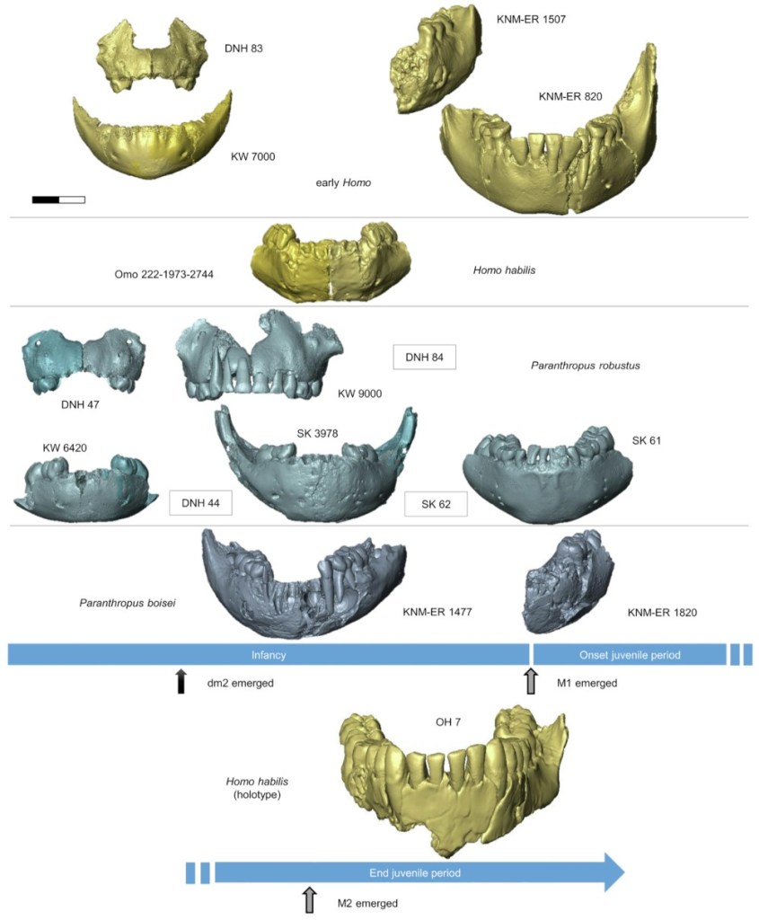 - El estudio de las estructuras dentales y craneales de tres especímenes infantiles de Homo tempranos de 2 Ma revela una gran diversidad de rasgos (Braga y Moggi-Cecchi, 2025). Se trata de la mandíbula Omo 222-1973-2744 atribuida a Homo habilis, y la mandíbula KW 7000 de Kromdraai y el maxilar DNH 83 de Drimolen, atribuidos a Homo aff. erectus. El estudio revela una combinación única de rasgos mandibulares y dentales en estos individuos infantiles, que sugiere una diversidad de trayectorias de desarrollo desde el nacimiento en los Homo tempranos. Los autores sugieren la existencia de ramas evolutivas bien diferenciadas dentro del género Homo, y subrayan la importancia de este factor para la búsqueda del antepasado común de Homo entre los australopitecos.