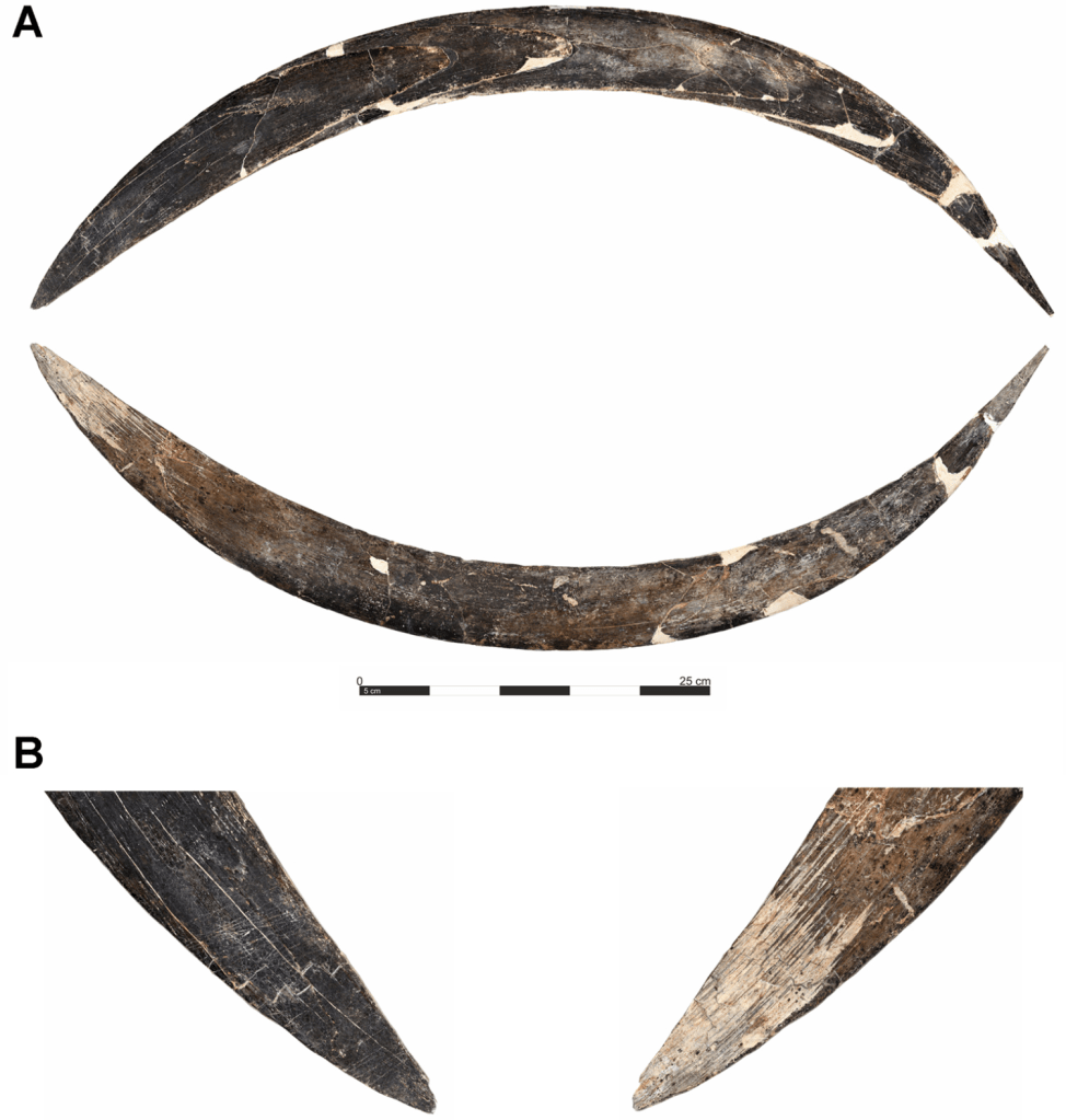 - Esta sorprendente herramienta de 72 cm de largo tipo bumerán, hecha con marfil de mamut, procede del nivel VIII de la cueva de Obłazowa (Polonia) y su antigüedad estimada es 39-42 ka, que es la datación de 14 huesos de animales y humanos encontrados en asociación con el artefacto. Como no se encontraron otras herramientas cerca, los autores asumen que el bumerán fue llevado por cazadores-recolectores migratorios. Se emplearía para cazar, cavar, raspar y, dado que tiene restos de pigmento rojo, también pudo haber tenido una función simbólica o ritual (Talamo, Casaccia, Richards, Wacker, Tassoni, Nadachowski, et al., 2025)