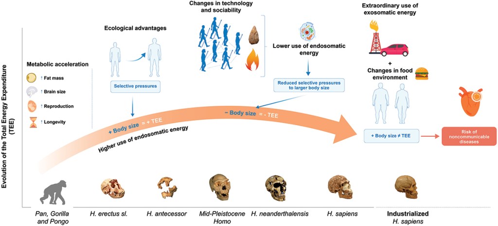 - Hasta ahora, las estimaciones publicadas del gasto energético de los homininos asociado a sus niveles de actividad física habían supuesto valores para los cazadores-recolectores actuales y otras poblaciones con economías de subsistencia de 2 o 2,5 veces el gasto de un atleta de resistencia actual. Un estudio de Prado-Nóvoa y colaboradores afirma que el gasto energético diario estaría sobreestimado en unos 8,4 MJ/día. Los autores han reevaluado el gasto energético en el género Homo de acuerdo a ecuaciones predictivas no basadas en los niveles de actividad, sino en la masa corporal de 112 individuos (H. erectus sensu lato, H. antecessor, otros Homo del Pleistoceno medio, H. neanderthalensis y H. sapiens). El estudio sostiene que durante los últimos 2 Ma probablemente se haya producido una aceleración y desaceleración metabólica vinculada a los cambios en la masa corporal. Estos cambios podrían estar relacionados con la capacidad de ciertas especies para utilizar diferentes fuentes de energía internas y externas (fuego, herramientas). Con ello, se concluye que no debemos asumir que nuestros antepasados vivían en su límite metabólico todos los días (como «máquinas incansables»), sino que la evolución trata de minimizar los costos energéticos innecesarios («aprende a ahorrar»). Nuestra historia metabólica es compleja, adaptativa y eficiente.