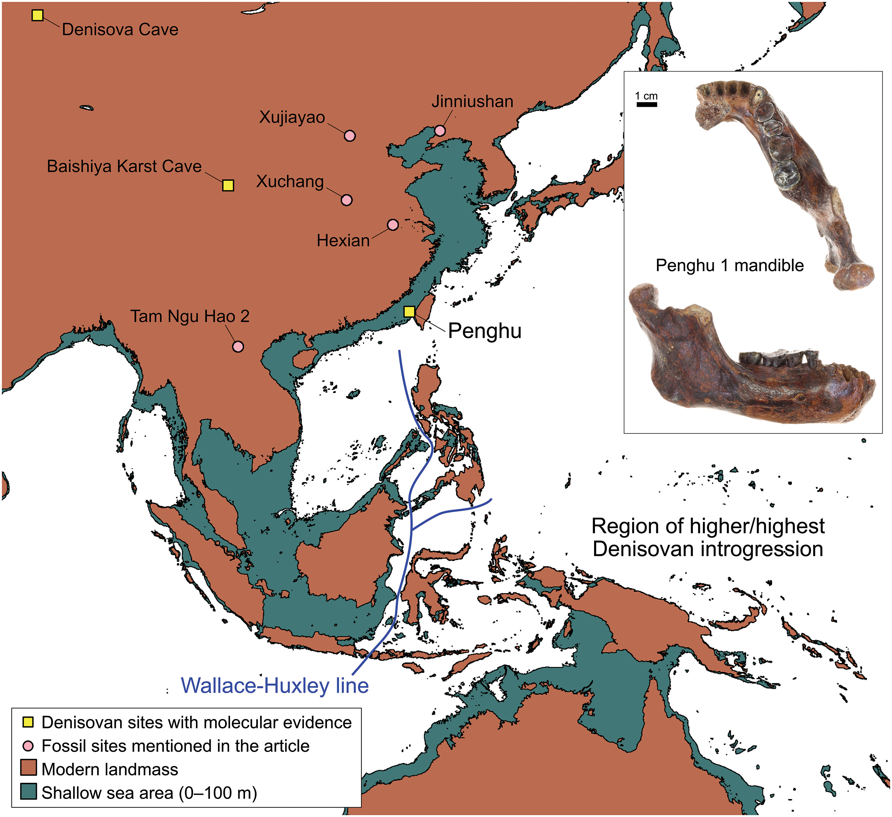 - La mandíbula de Penghu fue recogida en 2008 por pescadores en un canal submarino homónimo, a unas 15 millas de la costa. El estudio de 4241 restos de aminoácidos de 51 proteínas recuperadas de Penghu 1 ha permitido identificar dos variantes específicas de los denisovanos (Tsutaya et al., 2025). El análisis filogenético también agrupa la mandíbula con los denisovanos. Este hallazgo muestra cómo los desinovanos se desplazaron hacia el sudeste asiático, amplía su área de presencia (entre la Cueva Denisova a Penghu hay más de 4000 km) y ayuda a explicar el rastro de su genoma en el de los melanesios actuales.