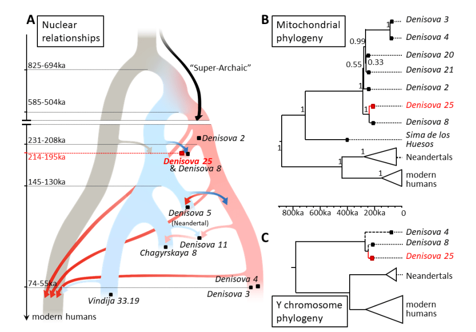 El estudio también identifica en D25 segmentos genómicos de gran divergencia filogenética, interpretados como posibles rastros de un linaje “superarcaico”, que habría contribuido material genético tanto a los denisovanos tempranos como, indirectamente, a las poblaciones actuales de Asia y Oceanía. La antigüedad de este linaje no se determina de forma directa, pero la separación entre los linajes humanos modernos y arcaicos se estima en 825–694 ka, y la de neandertales y denisovanos en 585–504 ka, por lo que el linaje donante superarcaico podría haber divergido mucho antes de 700 ka, aunque este valor depende de los modelos demográficos aplicados.