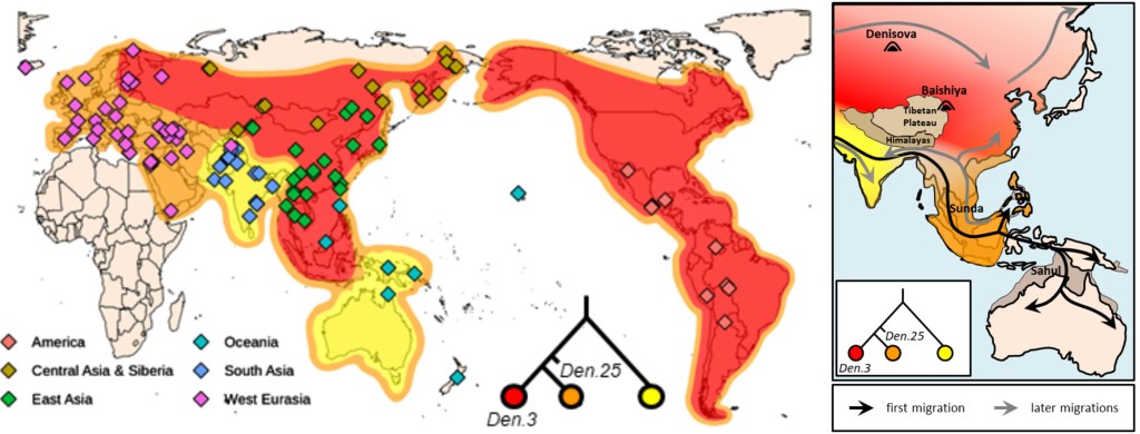 - Un linaje más antiguo, relacionado con la primera expansión denisovana hacia el sur de Asia, que contribuyó al acervo genético de pueblos de Oceanía (como papúes y aborígenes australianos), quizá a través de una ruta meridional temprana parcialmente aislada por la barrera natural del Himalaya.
