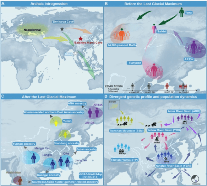 El resultado es una historia de contactos con humanos arcaicos, divergencias poblaciones durante el Pleistoceno y expansiones agrícolas durante el Holoceno. Esta nueva publicación refleja el fuerte crecimiento del volumen de datos de ADN antiguo de Asia oriental en los últimos años, aunque los resultados están limitados por la falta de muestreo en regiones cálidas y húmedas como el sur de China, donde la conservación del ADN es muy difícil.