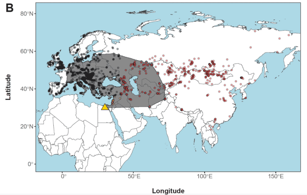 - Se han evaluado tres indicadores de introgresión neandertal-sapiens, es decir, la transferencia estable de material genético de la especie neandertal a H. sapiens mediante episodios repetidos de hibridación: la proporción de introgresión (PI), la longitud de los segmentos introgresados (LIS) y la variación de estas longitudes entre individuos distintos (VIS). Modelizando la expansión de los humanos modernos en los territorios neandertales, el preprint de Di Santo y colaboradores muestra que la proporción de introgresión neandertal corresponde a un gradiente estable y no a una variación abrupta (que correspondería a pulsos aislados de hibridación). El gradiente se mantuvo estable durante más de mil generaciones, incluso después de la desaparición de los neandertales. Este patrón se correspondería con una única fase prolongada de hibridación en el Levante, Europa occidental y Asia central, y abarcaría los yacimientos neandertales conocidos salvo los de Altái. Por tanto, la hibridación habría acompañado la expansión de humanos modernos a lo largo de miles de kilómetros, generando pulsos continuos de intercambio genético.