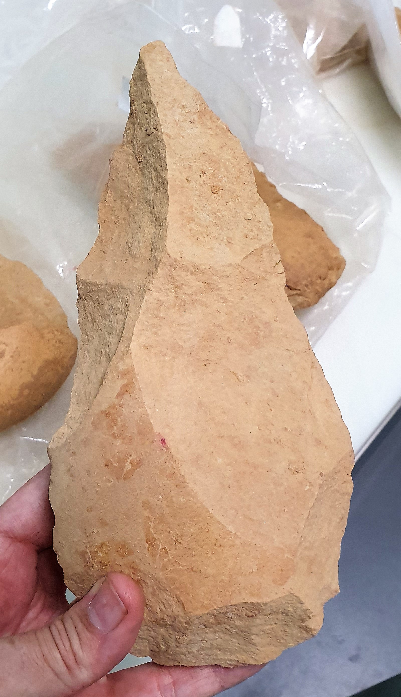 Lo más interesante es que casi todas las piezas están acabadas. Las lascas y núcleos que se encuentran son material que está rodado, viene arrastrado con el sedimento. Lo que vemos es una acumulación de piezas acabadas, una especialización. Las piezas en sí mismas son aparentemente toscas y elementales, con un nivel de configuración bajo: pocos levantamientos, grandes y hechos con percutor duro. Fuera de África, salvo en Gesher (Israel), no hay ningún otro conjunto con una acumulación tal de LCTs achelense.