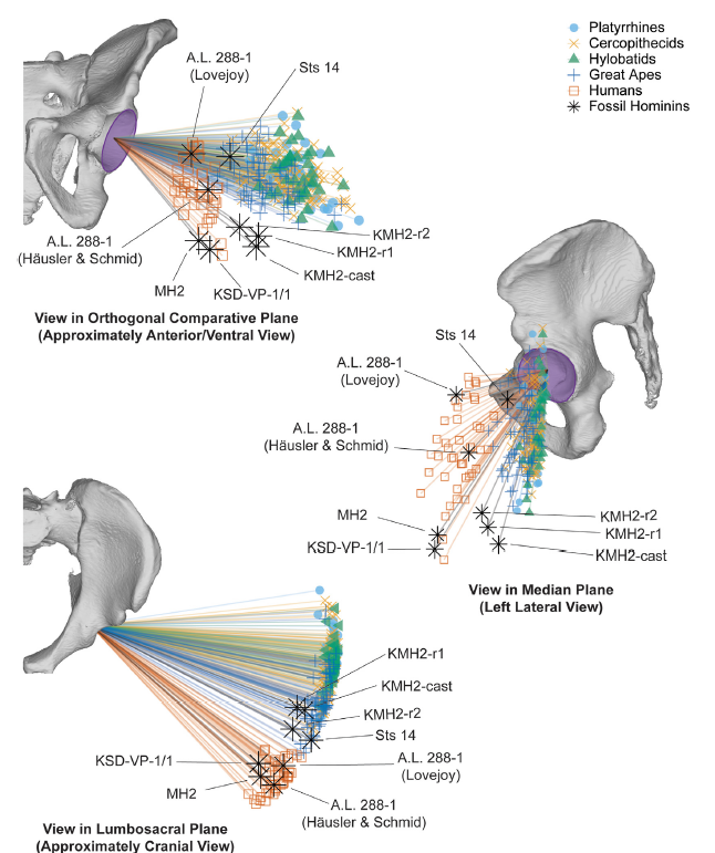 • La orientación acetabular de los Australopithecus era esencialmente similar a la humana hace 3,6 Ma, atendiendo a la comparativa de los acetábulos en una muestra de primates antropoides existentes y homininos fósiles que incluyen Australopithecus afarensis (AL 288–1, KSD-VP-1/1), Australopithecus africanus (Sts 14), Australopithecus sediba (MH2) y Homo neanderthalensis (Kebara 2). El cambio en la orientación acetabular de los homininos fue probablemente un rasgo seleccionado para la locomoción (Lawrence, Hammond, Ward, 2025).