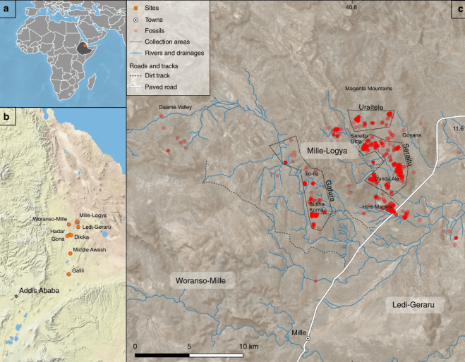 Crédito: Alemseged, Z., Wynn, J.G., Geraads, D. et al. (2020) Fossils from Mille-Logya, Afar, Ethiopia, elucidate the link between Pliocene environmental changes and Homo origins. Nat Commun 11, 2480