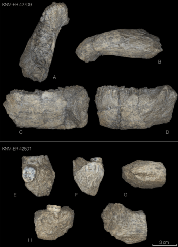 • Dos nuevas mandíbulas de Paranthropus boisei aportan información muy interesante sobre esta especie [+]. Por un lado, KNM ER-42709 es una hemimandíbula sin dientes datada en 1,4 Ma, el parántropo más reciente conocido en Kenia hasta ahora, y uno de los más recientes del registro fósil junto con KGA 10-525 de Konso (1,42 Ma) y OH 80 (1,338 Ma). Por otro lado, KNM ER-42801 es un fragmento mandibular con un molar M3 datado en 1,55 Ma. Su entorno se caracterizaba por la abundancia de vegetales tipo C4, en un momento previo al incremento de la cobertura forestal (plantas C3) que tuvo lugar en la transición del Pleistoceno inferior al medio (1,3-0,7 Ma en el este de África). Estos dos especímenes enriquecen la variabilidad intraespecífica en las dimensiones dentales y del cuerpo mandibular.
